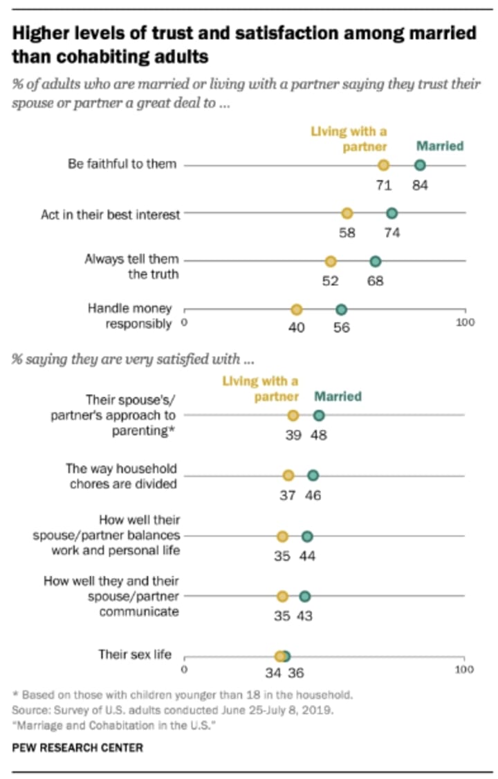 They compared the level of trust and satisfaction between married couples and unmarried couples that are living together. The figure above shows that cohabitating couples are not much different from married couples.