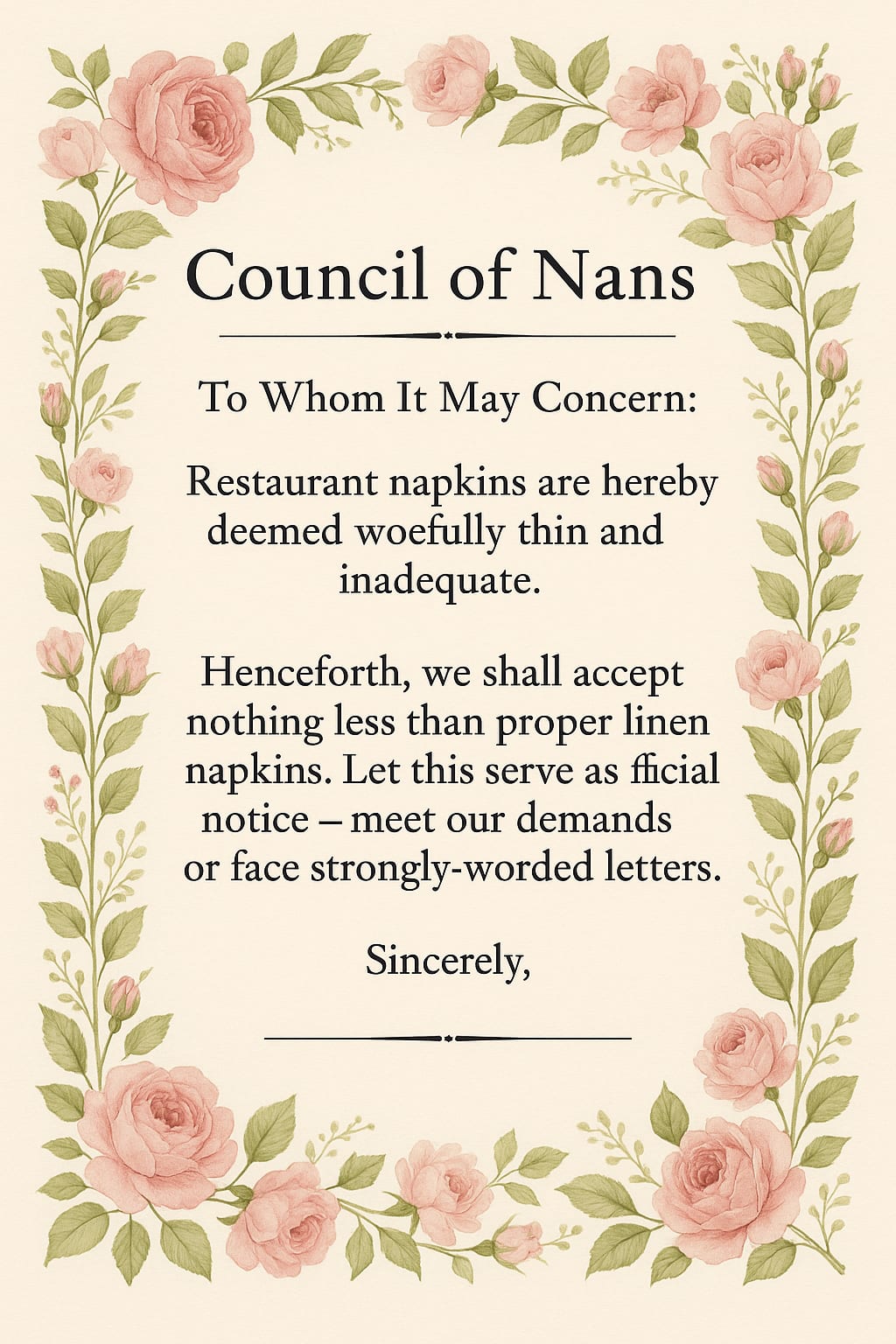 Until then, the war continues. Restaurants brace for the floral-scented fury of handwritten letters. Servers whisper nervously about “the day the Nans came.” And across the country, grandmothers sharpen crochet hooks, iron their linens, and prepare for the next battle.
