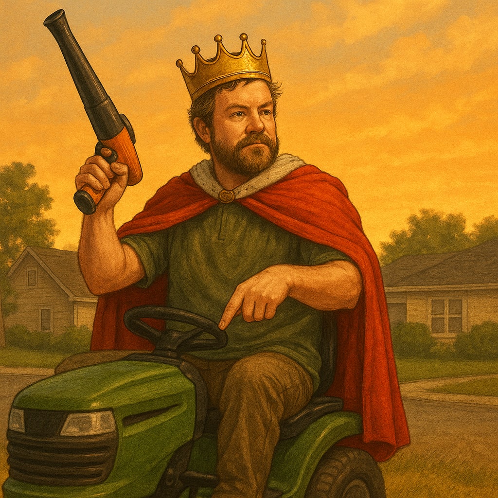 Standing atop his zero-turn John Deere mower, wearing a plastic crown from Party City and wielding a gas-powered leaf blower like a scepter, Steve announced his new sovereign state: