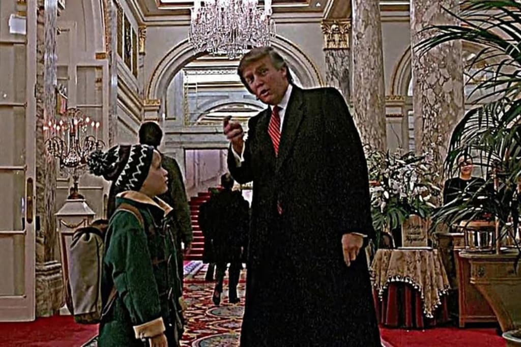 The scene in question takes place in front of and inside the Plaza Hotel in New York City, one of the most iconic locations in Manhattan, which was under Donald Trump’s ownership at the time. A significant portion of the movie’s storyline is set at this hotel. In the brief cameo, Donald Trump plays himself. The main character, a young boy named Kevin McCallister — played by Macaulay Culkin — is seen wandering through the lavish hotel lobby, searching for help. He approaches a man in a black overcoat and red tie and politely asks where the lobby is. Trump, in a straightforward tone, replies, “Down the hall and to the left.” That simple line has now become a pop culture reference point, partly because of Trump’s later rise to the presidency.