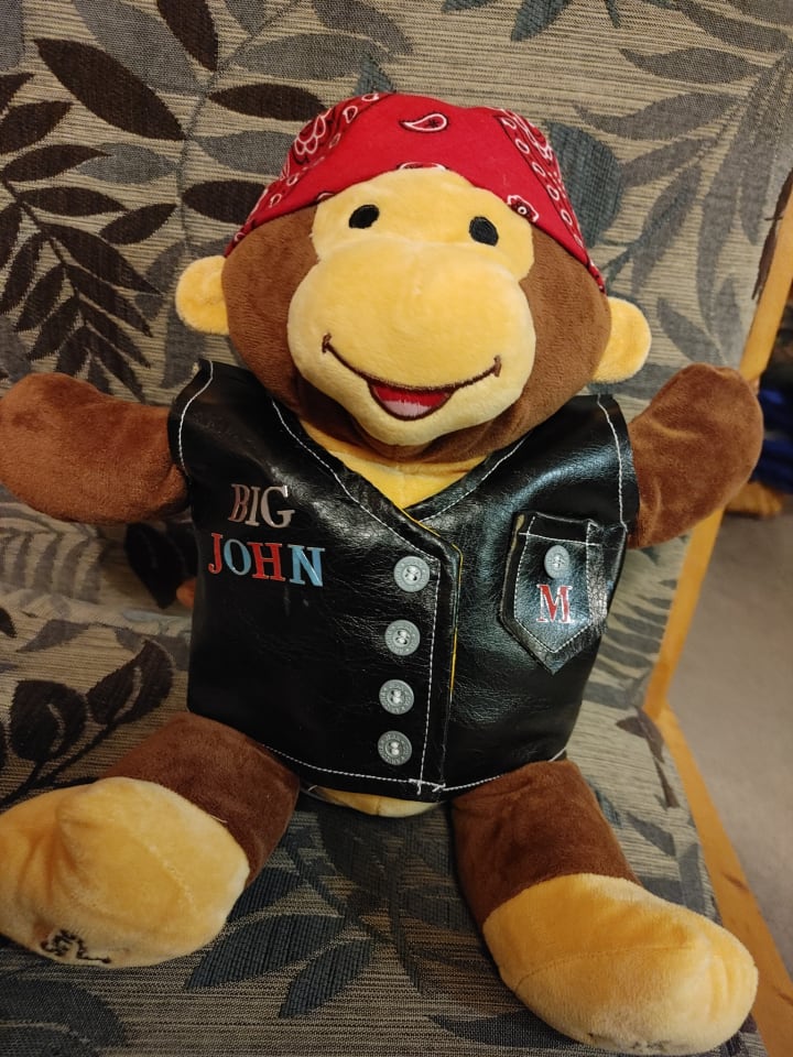 His sister gave him a bunch of bananas, a game in a cloth banana bag, and a monkey with a leather vest that she made with an M for monkey and Big John on the vest! Is that funny?