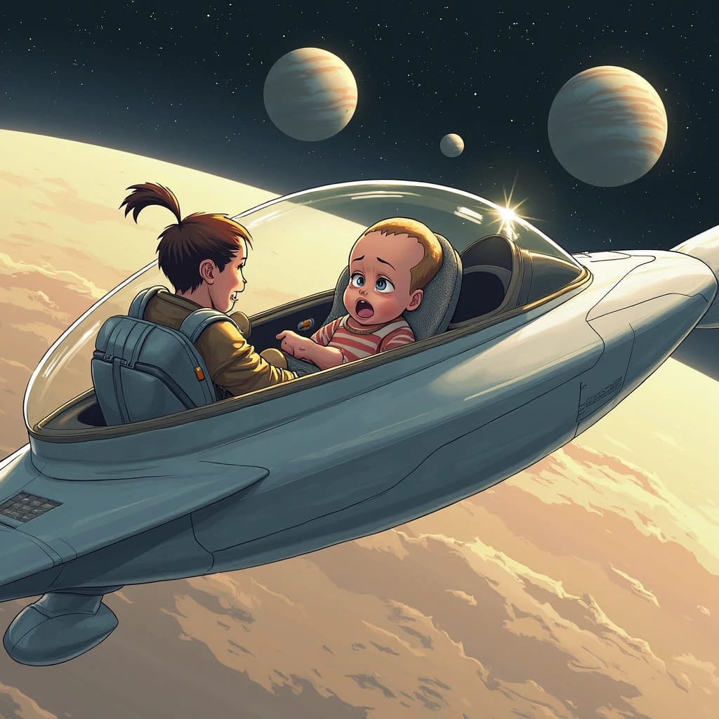 There's a baby in the back of the glider, but it's not mine. Sure, she looks like my baby, but my baby never cries when we're cruising through the Kuiper belt. Quite the opposite. Cruising through the solar system's outer reaches is sometimes the only way I can get her to fall asleep.
