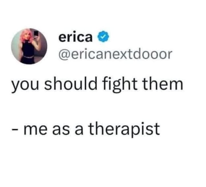 Hahahahahahahaha my favourite numbers 2! 🤣🤣🤣🤣🤣 Oh and I'm definitely that therapist in number 10! I'm 35 years old and I have never broken a bottle on someone's head before. Yes, that's on my bucket list, in case you're wondering 🤣🤣🤣🤣🤣🤣🤣
