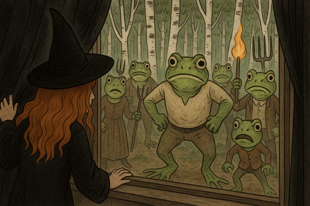 A small army of abominations was headed her way. A classical witch-hunt, if it hadn’t been for the humongous, swamp-green heads wobbling angrily on necks of various lengths and widths. That and the slimy, webbed hands wrapped around the wrought-iron pitchforks and torches. And the long mouths that ran across their faces in thin lines, blending into brown-spotted cheeks. And the large yellow eyes that bulged out from under thick lids, with black almond-shaped irises that stared in opposite directions from one another.