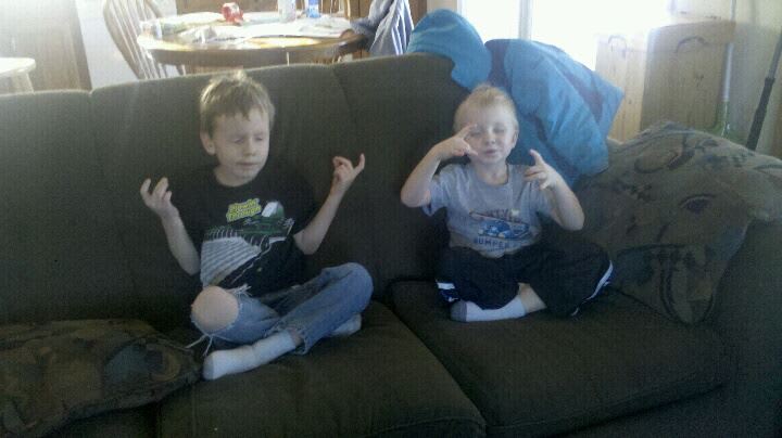 I was at my daughter's house for a visit when I came upon two of her boys meditating. I knew I had heard them talking about spinjitsu/ninjitsu and wondered where they heard that from. So I asked. "Who taught you to meditate?"