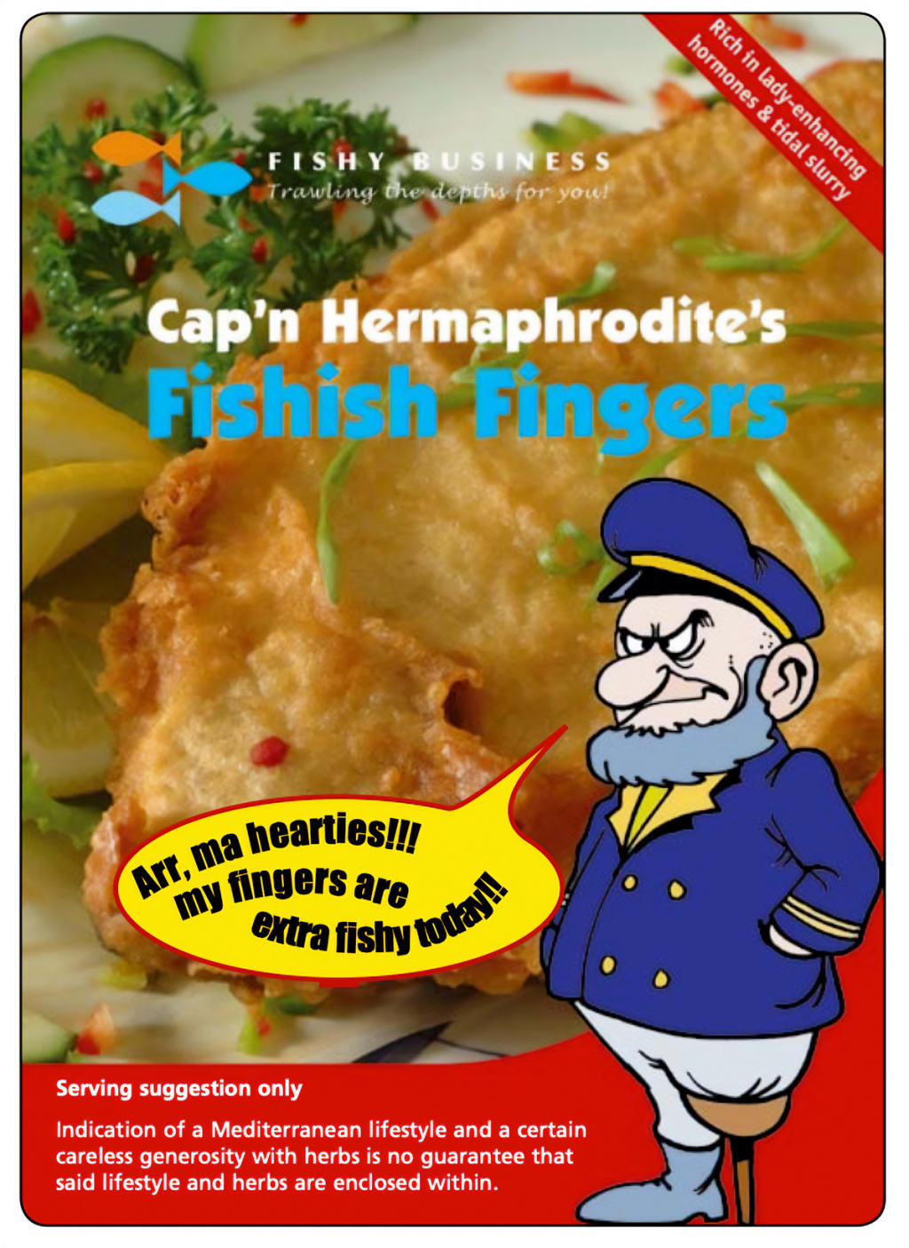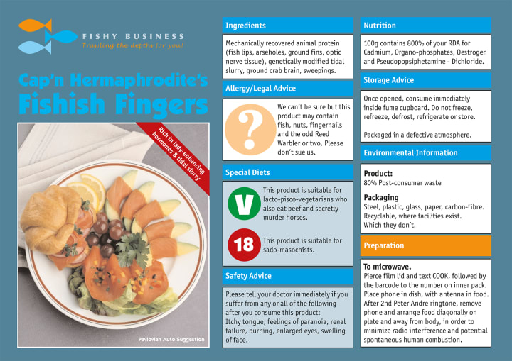 Cap’n Hermaphrodite’s Fishish Fingers (above) is a typical packet of convenience food aimed at the family market. It features bright, primary colours, an encouraging photograph to elicit the production of saliva, along with the added value of a slightly disturbing caricature that somehow communicates with the dark recesses of your child’s mind to pile on the pester pressure.