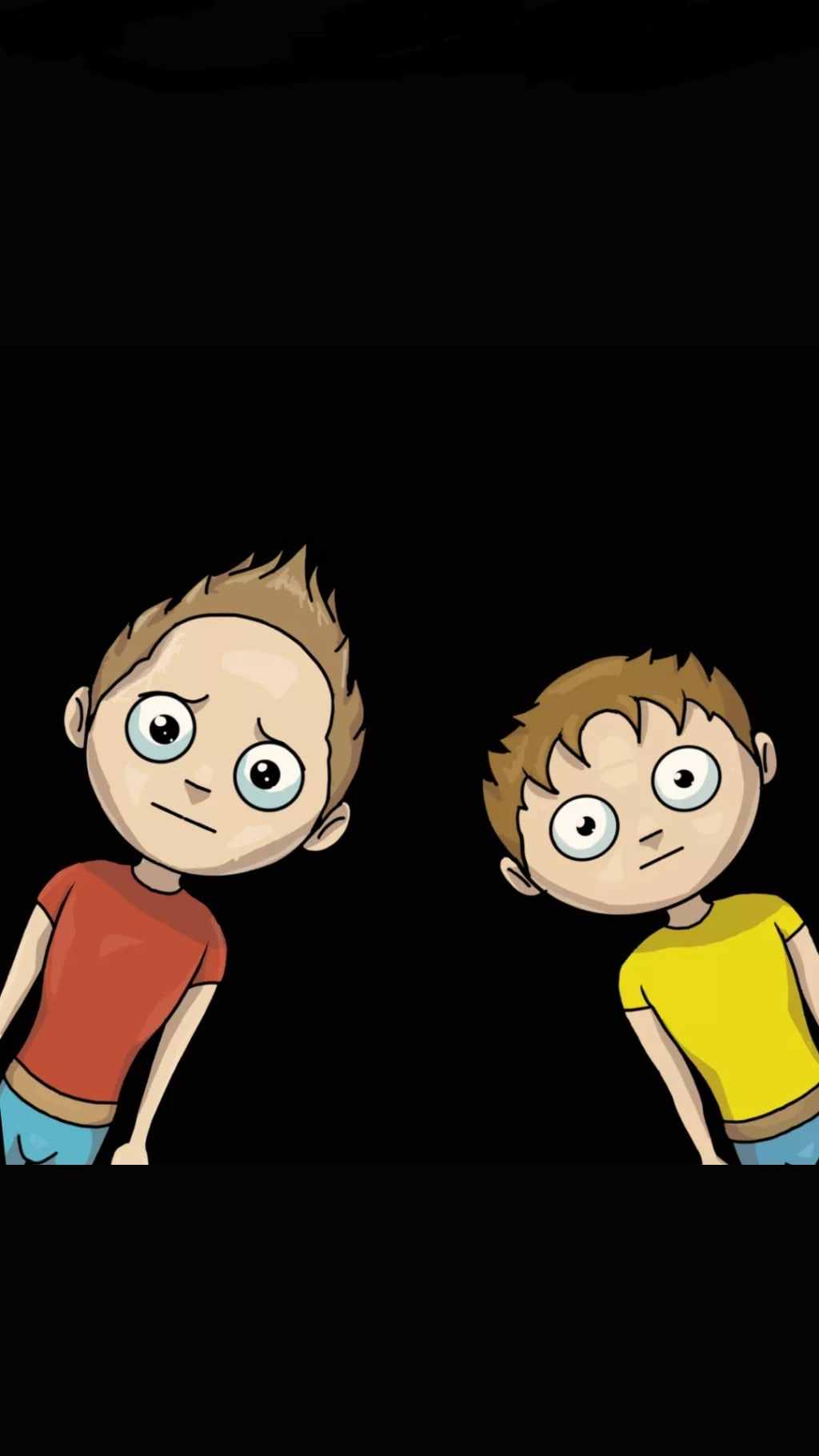 Zane stands at the bottom of the stairs. He is skinny wearing blue jeans and a yellow t-shirt. Zeke walks into view at the top of the stairs in his blue jeans and a red t-shirt.