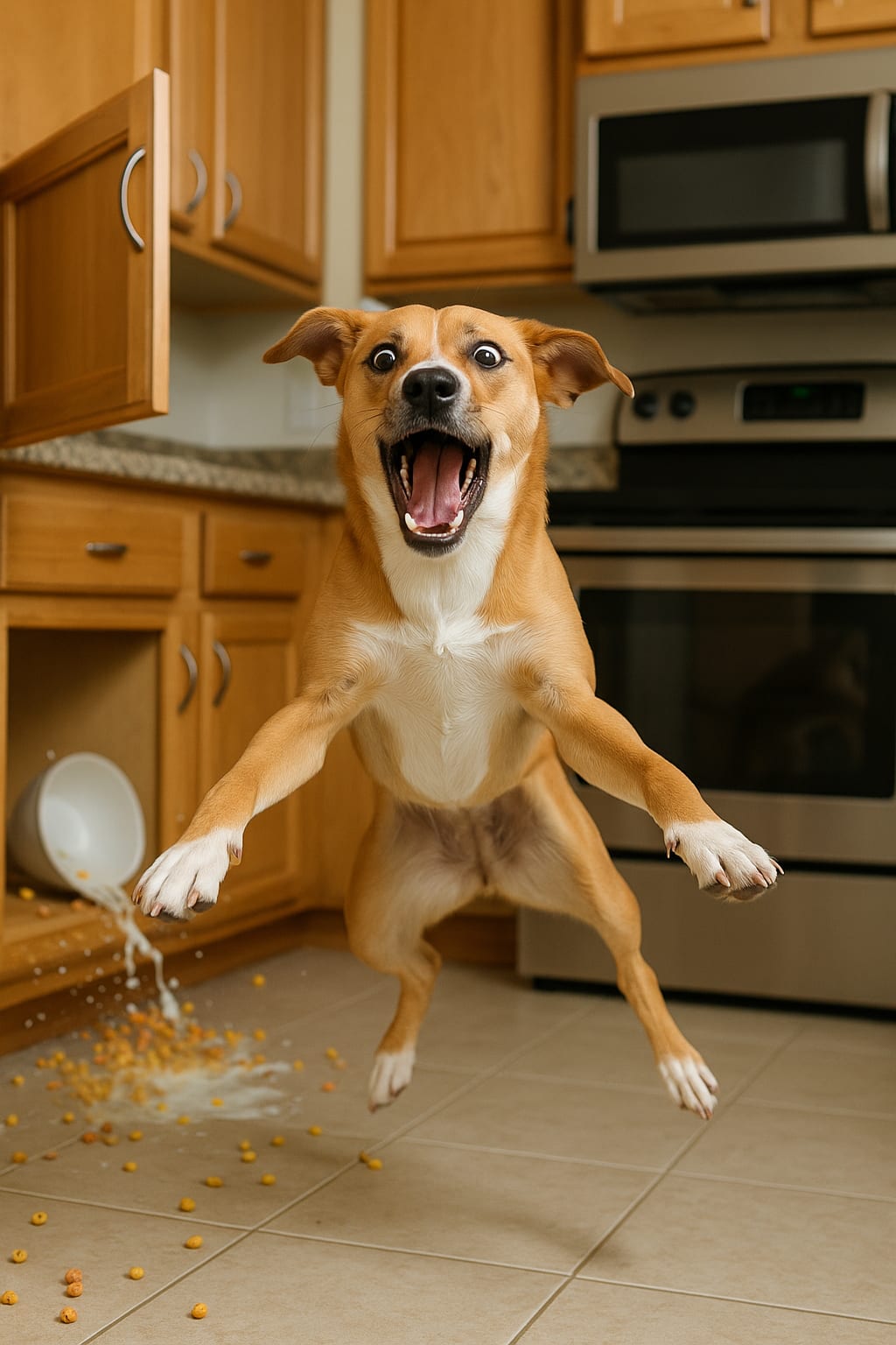 I watched the footage. There was Charlie, a blur of fur and enthusiasm, executing what could only be described as a Cirque du Soleil move, followed by a cereal explosion that made it look like I had just entered a war zone.