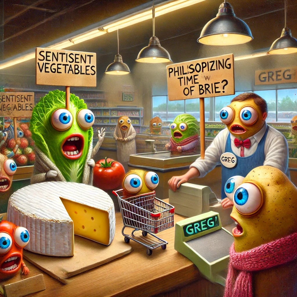 I turned to leave, but the cheese section had other plans. A wheel of brie wobbled toward me. "You must make a choice: fresh or aged? Consumerism or artisanal craftsmanship?" I tried to explain that I just wanted a grilled cheese sandwich, but the brie simply sighed. "Ignorance is bliss."