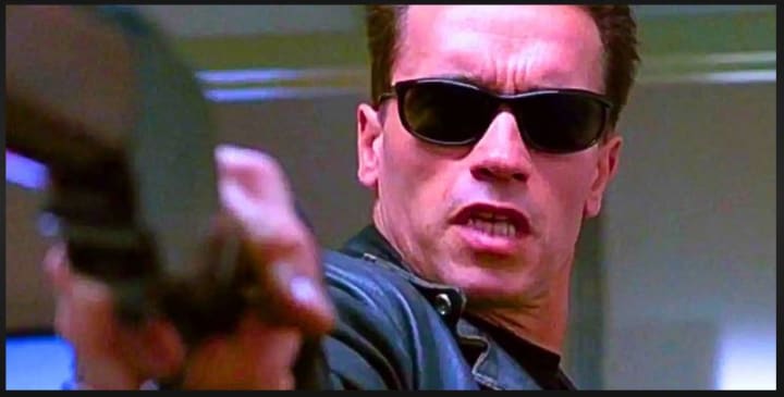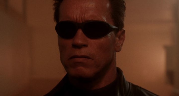 The Terminator walks to the door of the flat, turning only to say "I'll be back"