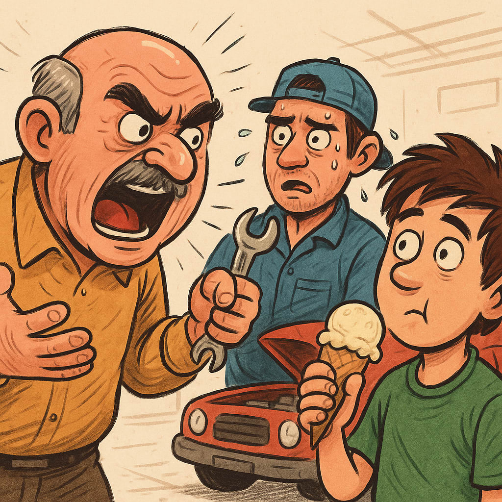 “Uh, Sir… calm down, don’t worry, he’s just a kid,” the mechanic said, nervously. “I’ll take care of everything. You’ll have the car good as new.”