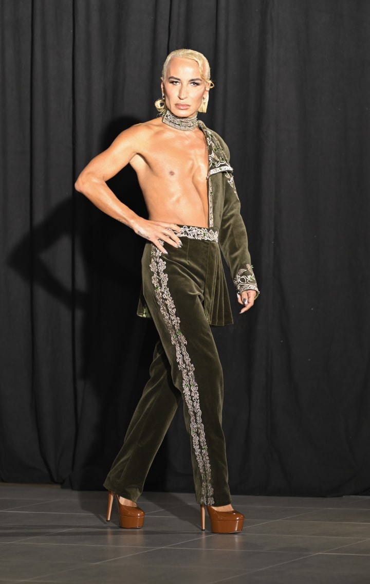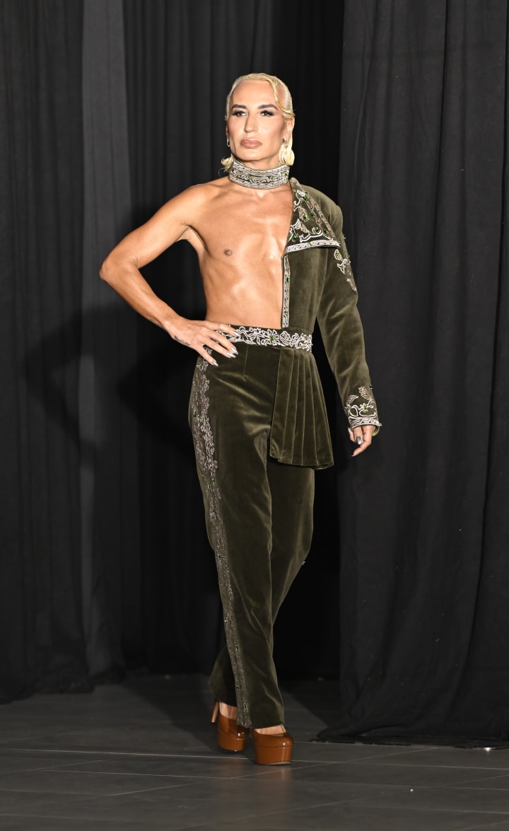 A highlight for many was Ilirjani's commanding presence on the runway, walking for both Icelandic brand ICEWEAR and the New York-based Arabesque Boudoir Maison. Maya Mosteghanemi's Arabesque Boudoir, founded in 2023, captivated the audience with its unique fusion of Renaissance and Ottoman Empire cultural styles, reimagined with a modern, genderless sensibility. “With Arabesque Boudoir, Maya is trying to bring the Ottoman Empire style into more modern and genderless vibes and colors,” Elton explained. He added, “I opened and closed the show,” highlighting the couture's intricate details and the collection's luxurious appearance, crafted from German velvet, lace, gold and silver silk threads, and exquisite hand-made embroidery.