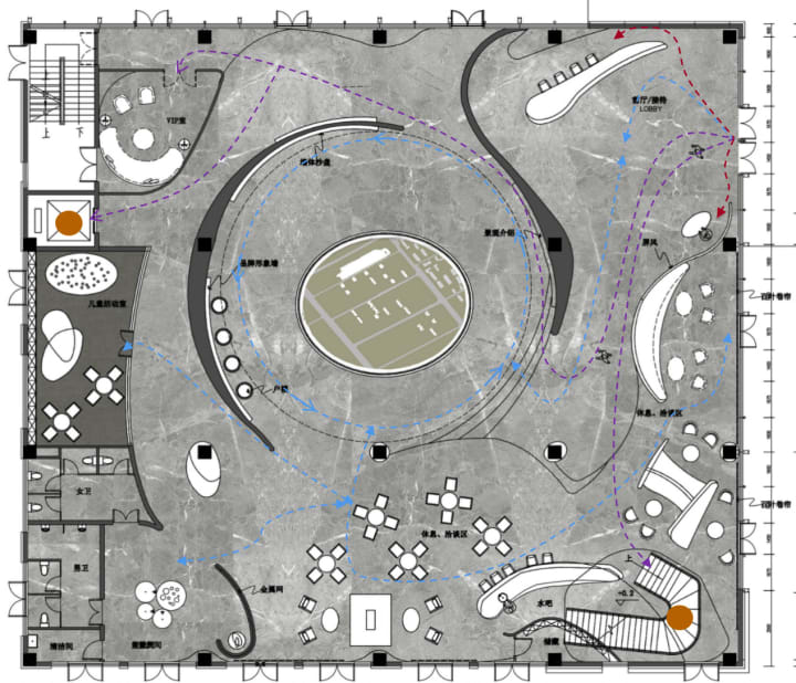 Two sets of curved structures naturally form two relative openings in the center, serving as the necessary path for initial and subsequent visits, and the core area carries the functions of diversion and guidance. The foyer, negotiation area, water bar, activity area, VIP room, and washroom naturally follow the flow on the periphery. F1 is like a large street-centered park, where people scatter around the central landscape in groups according to the type of activity, the spatial scale making it perfectly separate and blend.