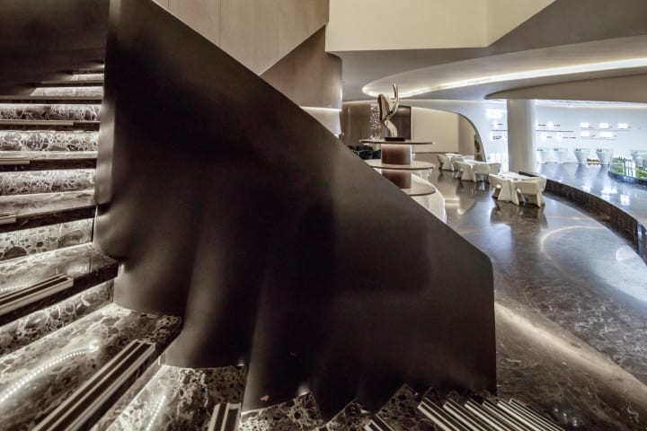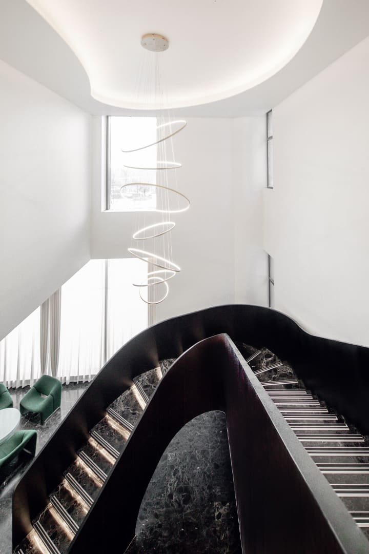 On the simple black and white and transitional color bands, the sculptural interior is more upright and powerful, and the entire sandbox of Jiangnan's floral language floats like an oasis in the vast land of consciousness. The steel staircase rises from the ground, connecting the second-floor office area, finance room, VIP room, and other private spaces. The upward-twisting structural body forms a fascinating tension against the white background.