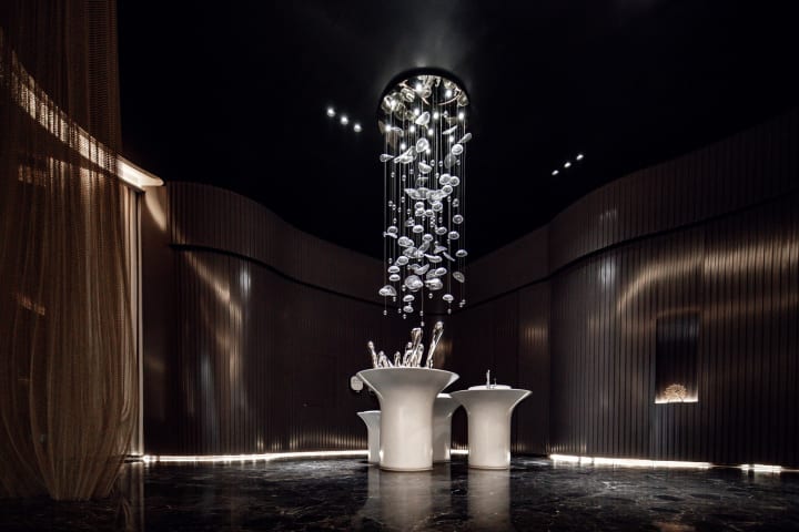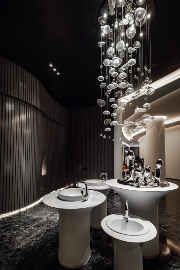 In the vast space of artistic background, almost all decorative languages are hidden, only doing the grand brushstrokes of nature. The washroom space breaks tradition, with smooth surfaces enveloping dark striped panels. A group of jellyfish installations illuminate, splashing frozen water droplets from the roof, immersing people as if in the deep sea.