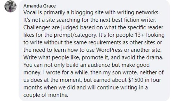 Some time ago, I saw this post on The Vocal Creators Lounge group on Facebook where one of my fellow Vocal authors, Amanda Grace, gave a very nice quick summary of my main thoughts about Vocal when she wrote about it: