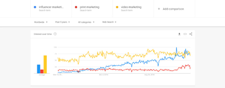 Influencer marketing has quickly grown in popularity during the last decade. In fact, according to Google Trends, it’s more popular than print marketing now and as popular as video marketing.