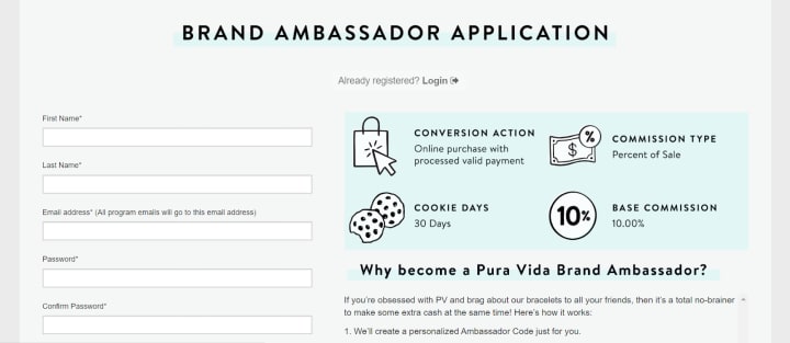 For instance, Pura Vida has a brand ambassador program where the brand ambassadors are given a 10% commission for every sale that they drive.