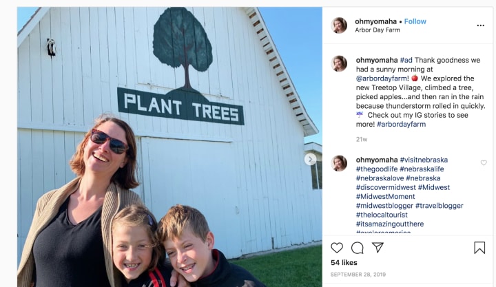 For example, Arbor Day Farm partnered with family bloggers from Omaha, Kansas City, and Des Moines to promote their property in Nebraska City. For instance, @ohmyomaha posted a sponsored Instagram post to increase brand awareness about Arbor Day Farm.