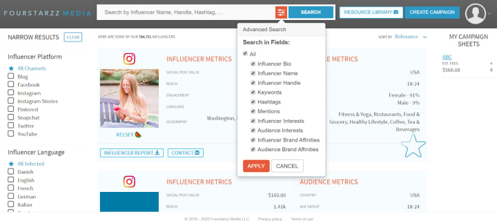To find the right influencer for your brand, you can use our influencer marketing platform, Fourstarzz Media. Our tool has a database of over 750K influencers, and you can filter them based on their location, niche, reach, engagement rate, etc.