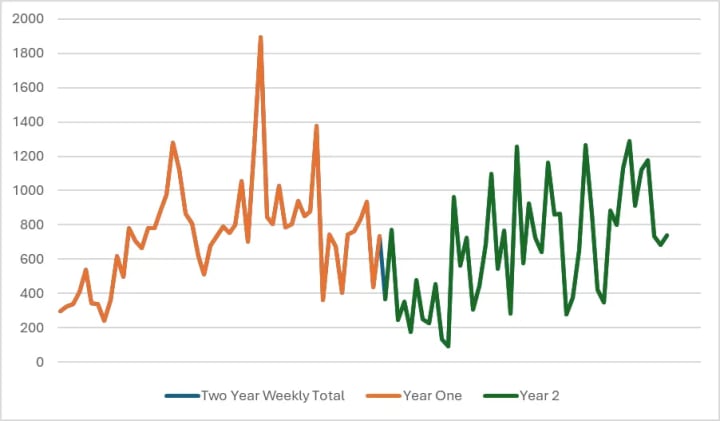 - The highest weekly total was 31 hours in year 1, week 33 (approx. June).