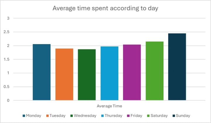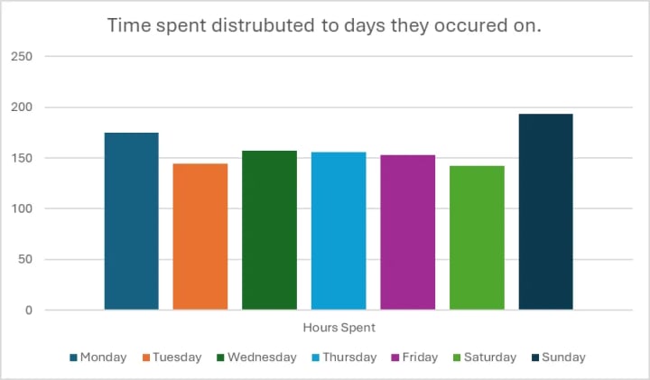 Looking at total time spent per day, we can see, relatively, all days are consistent, with Wednesday, Thursday, and Friday being the closest to each other. Sunday is noticeably the best performing day for productivity, with Monday coming in second, though with a significant drop. Saturday is just under Tuesday for the worst day. Without going into deep analysis, I can only make educated guesses as to why the averages are distributed as such.