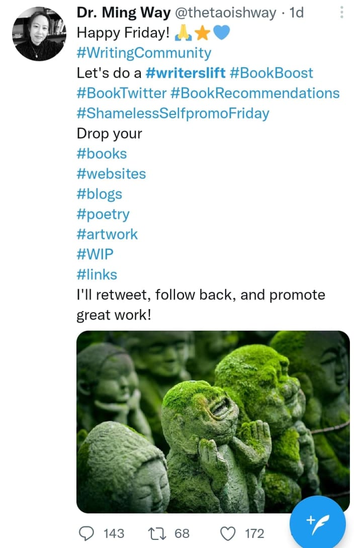 It quickly became less and less effective. It’s far better to post a lot of funny stuff, a few articles or blogs, and just a couple of Writer’s Lifts or Follow-for-Follow posts a week. It’s also good to post an interesting or funny pic when you do WL and FFF posts. Something that helps catch the interest of other Twitter users.