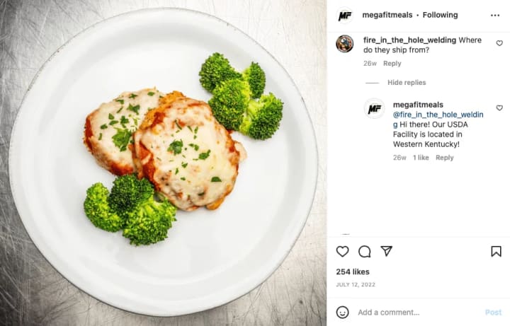 MegaFit Meals, a meal prep service, actively engages with their followers on Instagram and answers questions as they arise. In this example, they answer the common question about where they ship the meals from.