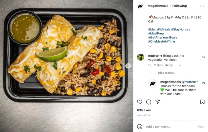 Take a look at another example from MegaFit Meals. A customer commented on a post asking if they would bring back the vegetarian version of their enchiladas.