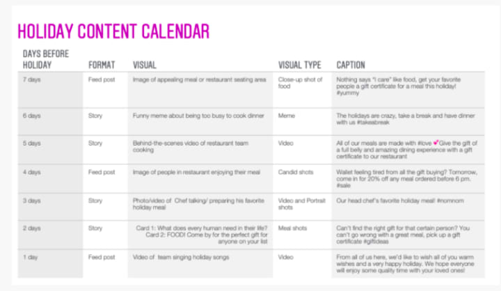 As a business owner, it's important that you plan your visuals and captions ahead of time. Instagram suggests using a Content Calendar much like this: