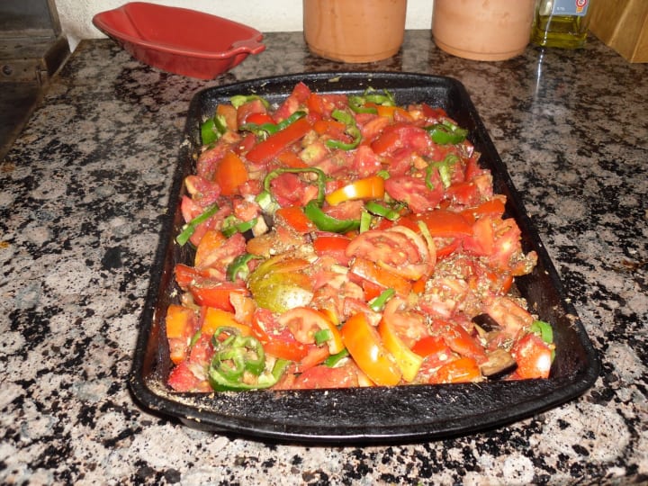 Soak and cook chickpeas... REMEMBER! To boil for a few mins, then simmer till soft, add a bay leaf and herbs but not salt or they'll be tough Meanwhile, in a heavy bottomed pan , fry off in olive oil the onions, tomatoes & aubergines, add thyme & parsley... Simmer till all is soft and melded together then add a dash of water, crumble in a stock cube. Add the rest of the veggies and simmer till soft and fragrant... add passata and hot sauce to your taste... (some may want to add a sprinkle of sugar if the tomatoes were not very sweet) Add chickpeas and cook for a few mins to let them absorb the flavours... Serve with boiled rice.