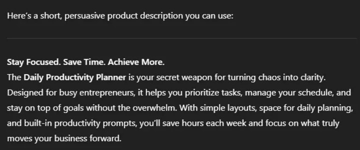 I opened ChatGPT and typed: Give me 10 digital product ideas in the productivity niche that people would pay for.