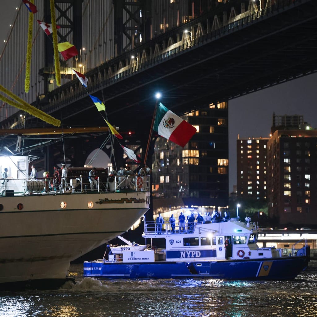 Around 8:26 p.m., the Cuauhtémoc, a 270-foot-long training vessel of the Mexican Navy, was gracefully gliding down the East River, adorned in vibrant lights and proudly flying its national flags. Onboard were over 200 sailors, crew members, and dignitaries—many enjoying the rare nighttime view of New York City from the deck. The ship, named after the last Aztec emperor, has long been a symbol of international friendship and tradition.