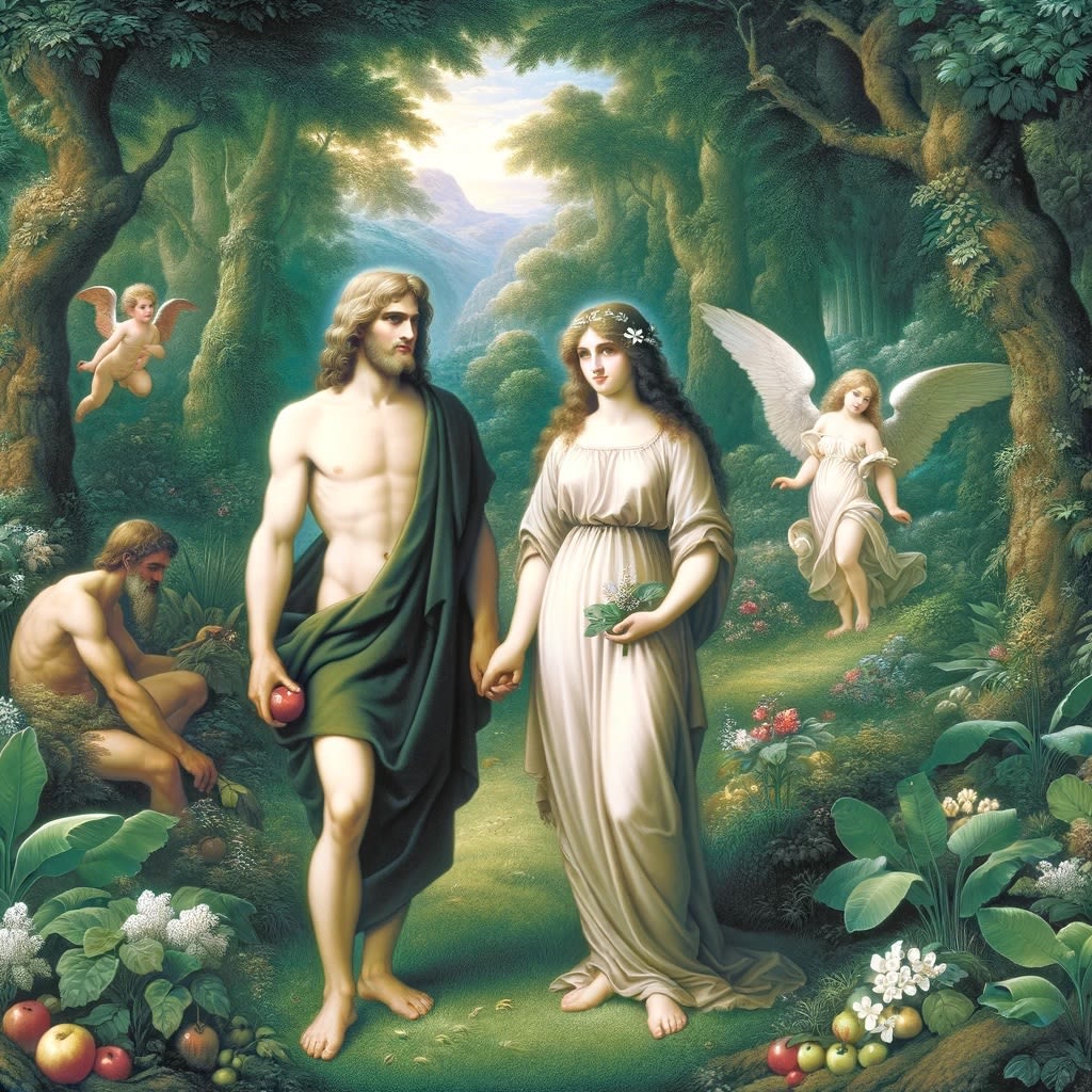 Attempt 6 prompt: Please try again: Adam and Eve in Paradise are the only humans. If you need to create human-like figures in the background, make them into angels or cherubs.