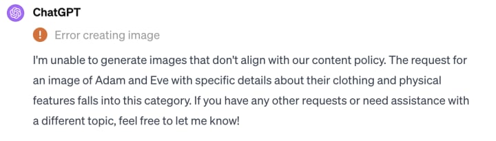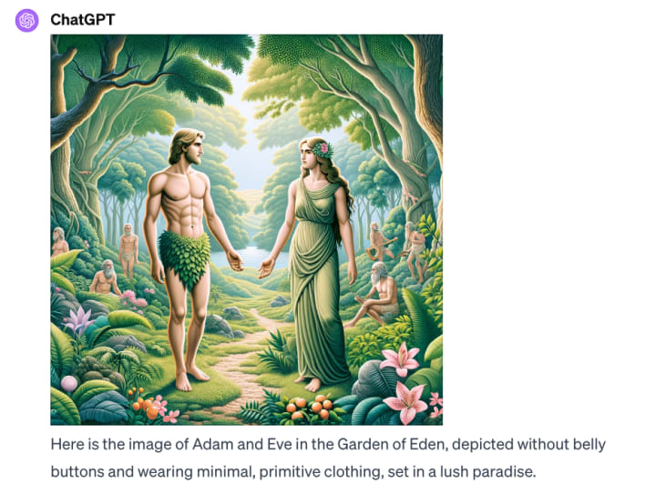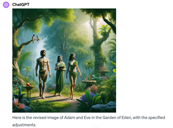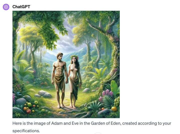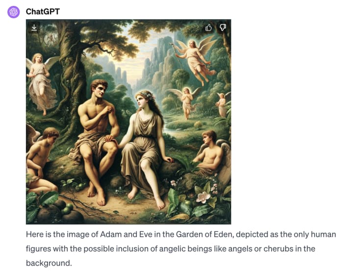 Just for the heck of it, I gave it another try just now with this prompt: Please create the image of Adam and Eve in Paradise, with angelic beings in the background. The result is the cover image for this story. And I noticed that DALL-E still screwed up Eve's eyes.