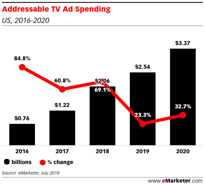 And so the eMarketer report, "Still Early Days for TV Ad Innovation," provides a roadmap on not just how far we've come, but a guide to what is to come in the future when it comes to "addressable" television advertising. As you can see in the chart below, while the growth rate is dramatically down in terms of such targeted television advertising between 2016 and 2020, addressable TV advertising is comprising an ever-larger share of overall television marketing expenditures.