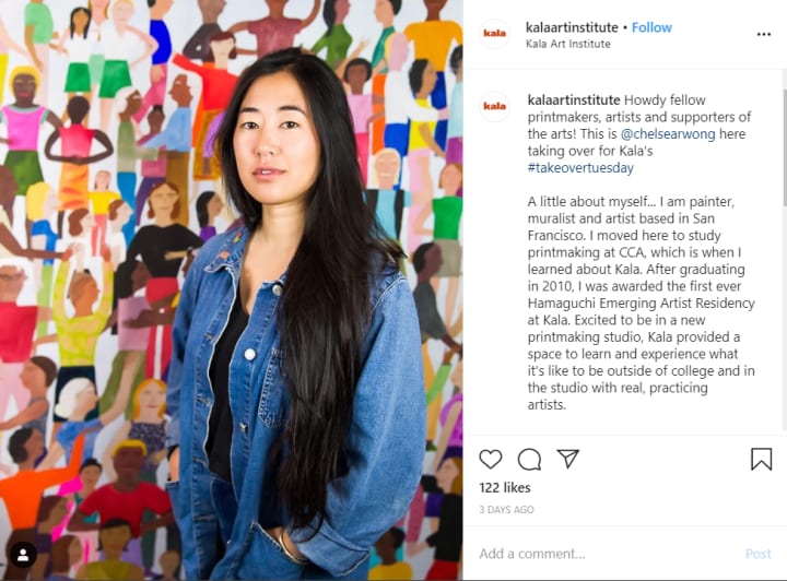 Kala Art Institute is an arts organization based in California. They partnered with Chelsea Wong, one of their students, for an Instagram takeover. This helped them get fresh content for their Instagram posts and meet their business goals.