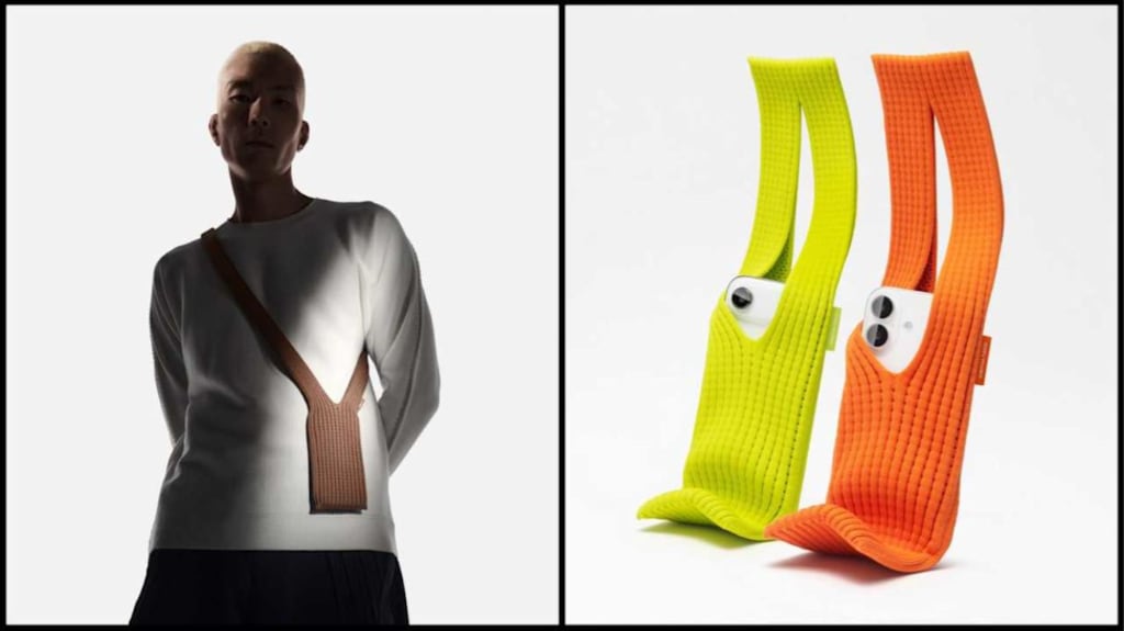 The pocket is a small fabric accessory. You can wear it around your neck or attach it to a bag. It holds an iPhone safely, without needing a full case or a large bag. The design is very clean. It uses soft materials, smooth lines, and a minimal style. It follows the idea that “less is more.”