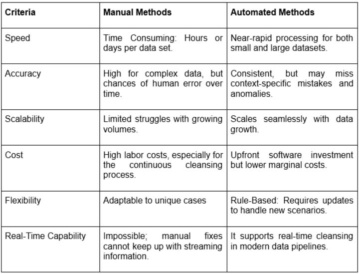 - Cleaning Process at Scale: Automated solutions excel when handling large datasets, processing thousands or even millions of records within minutes.