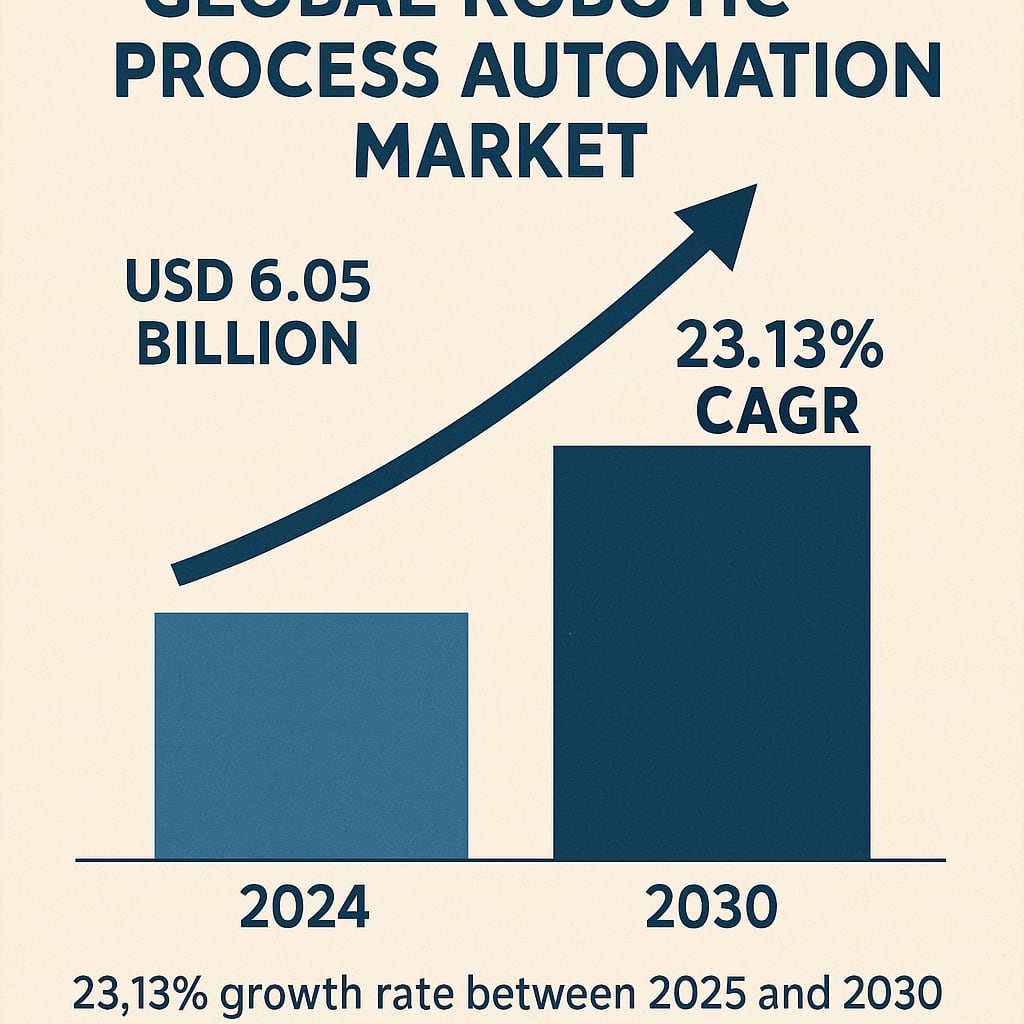 By 2024 the global Robotic Process Automation Market Size is projected to hit USD 6.05 billion and will experience a 23.13% growth rate between 2025 and 2030. Businesses' need for improved operational efficiency and cost savings fuels the market's development.