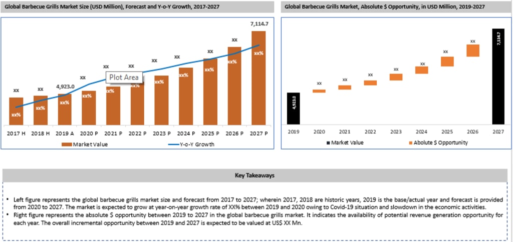 According to a recent market study published by Growth Market Reports titled, the Global Barbecue Grills Market was valued at USD 4,923.0 Million in 2019 and is projected to reach USD 7,114.7 Million by 2027, expanding at a CAGR of 4.9% during the forecast period. In terms of volume, the market is projected to expand at 4.0% during the forecast period. A barbecue grill cooks food by adding heat from underneath it.