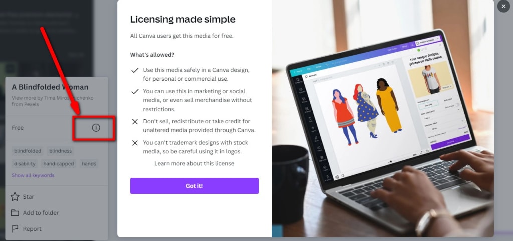 A second thing you may come across is that the image is from another free image website like Pixabay or Pexels. You will see that in the window of the rules of use. This is different as you must go by the rules of that website which overrides the Canva rules.