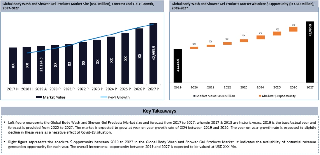 The global body wash and shower gel products market was valued at USD 31,184.0 million in 2019 and is projected to reach USD 42,993.9 million by 2027, expanding at a CAGR of 4.2% during the forecast period, 2020–2027. Body wash and shower gel product is a liquid-based cleansing agent for individuals that are used for cleaning dirt, oil, and sweat of the body. Currently, regular skincare is the biggest concern for individuals due to rising pollution. The key advantage of a body wash and shower gel is the fast and convenient use for cleaning the body, while providing a perfume-like fragrance. A body wash and shower gel are a traditional bar of soap, as it is easy to use with a loofah or bath scrubber/sponge. Body washes and shower gels are available in a range of different colors and scents. A shower gel typically has a higher amount of fragrance than a body wash.