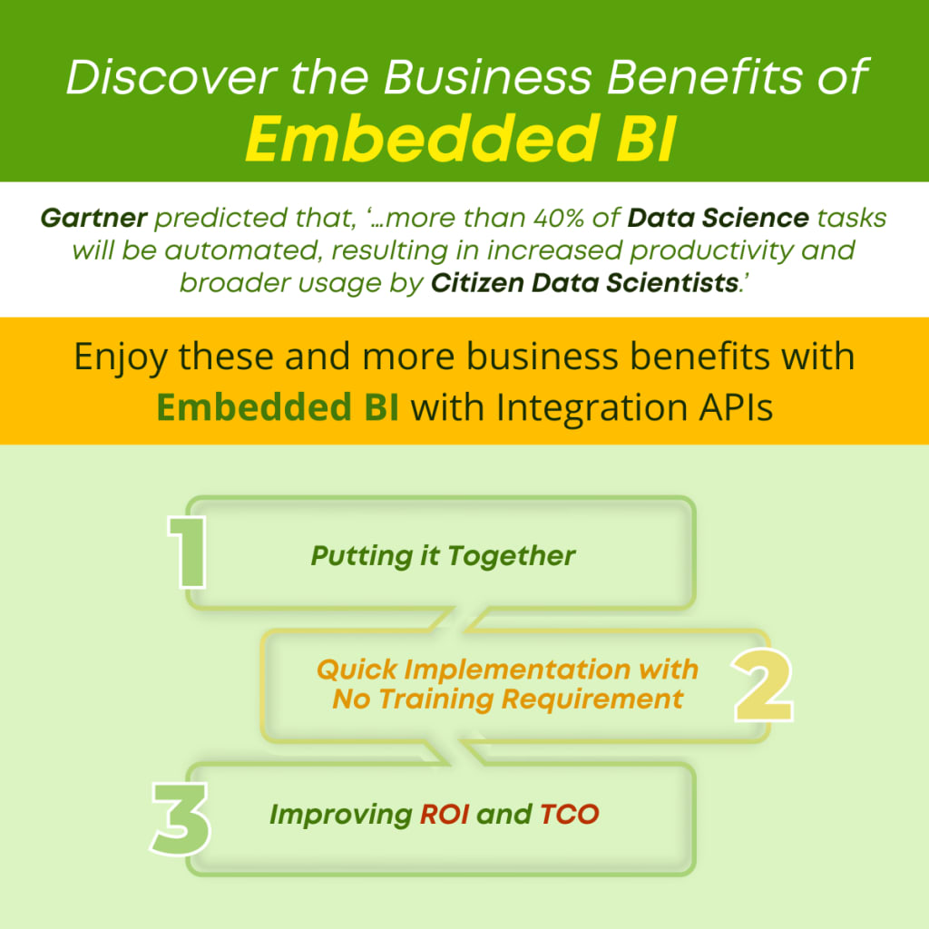 While Gartner and other technology consulting firms have rightly predicted the increasing use of augmented analytics and the rise of Citizen Data Scientists, the benefits and improvements inherent in these initiatives go far beyond productivity. By leveraging Embedded BI with Integration APIs, the organization can improve and optimize the use of existing technology and improve results by gaining insight into data, using existing systems and business processes.