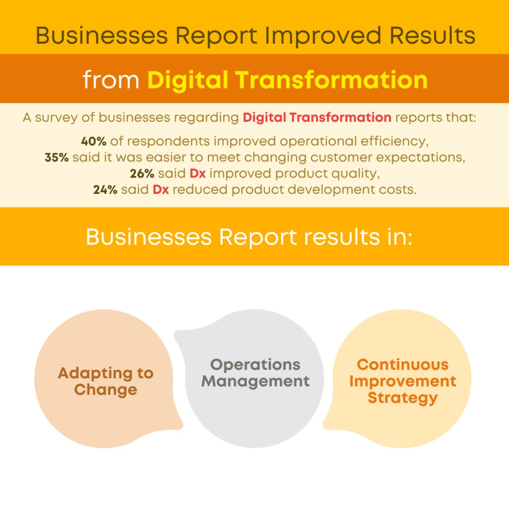 According to a survey of businesses regarding Digital Transformation (Dx), 40% of respondents reported improved operational efficiency, 35% reported that it was easier to meet changing customer expectations, 26% said Dx improved product quality, and 24% said Dx reduced product development costs.