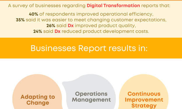 According to a survey of businesses regarding Digital Transformation (Dx), 40% of respondents reported improved operational efficiency, 35% reported that it was easier to meet changing customer expectations, 26% said Dx improved product quality, and 24% said Dx reduced product development costs.