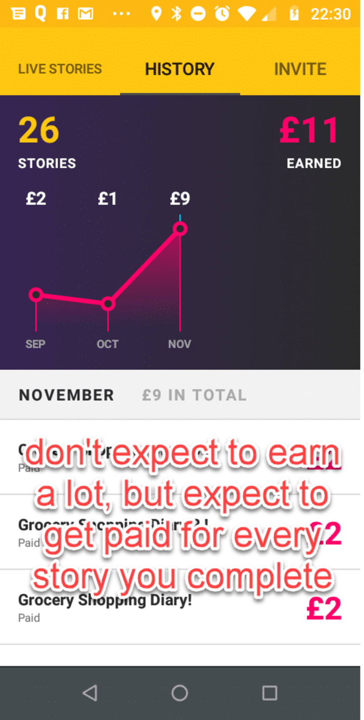 Similar to all the survey apps and websites out there, don't expect this app to make you rich. It will just be a supplement to your pocket money. The earnings vary depending on your location. The tasks are not very frequent, and you there's no push notification system. So you have to manually check it daily for any new stories to complete.
