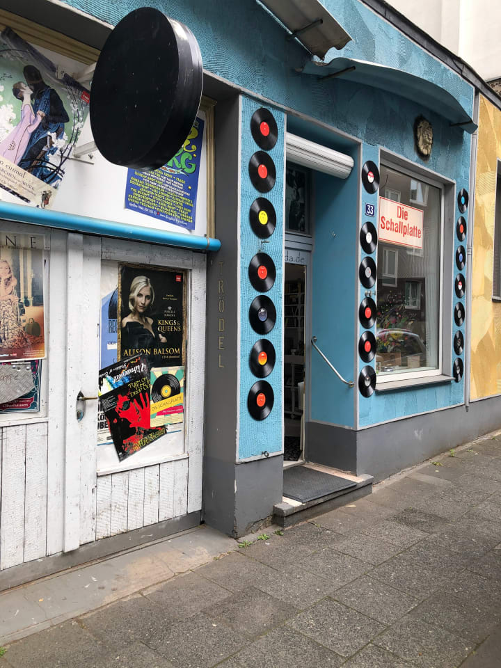 Strategic choices of exterior paint that complement the playful display of color-coordinated vinyl records, along with music posters, have ensured that this German record store attracts the attention of anyone hustling by what may otherwise be a drab street, inviting them to stop in and enjoy a fun musical experience.
