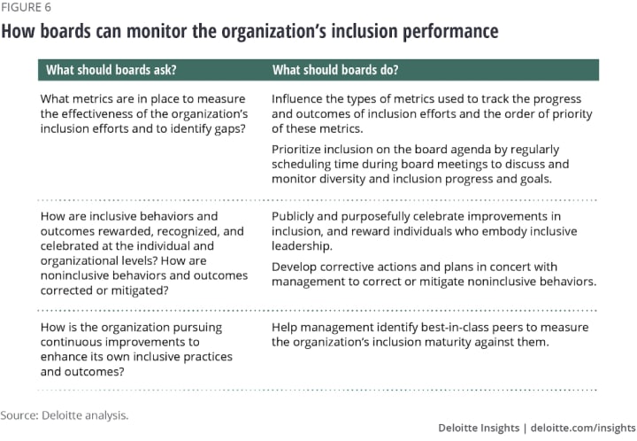 Now, here’s the trickiest part: measuring the overall environment of inclusion within the workplace. Such a task is not as simple as the previous two means by which boards of directors can hold CEOs accountable for inclusion, but it is just as important for successful implementation of DEI across an organization. As a starting point, Deloitte offers some general guidelines for boards of directors to monitor inclusion within their organization: