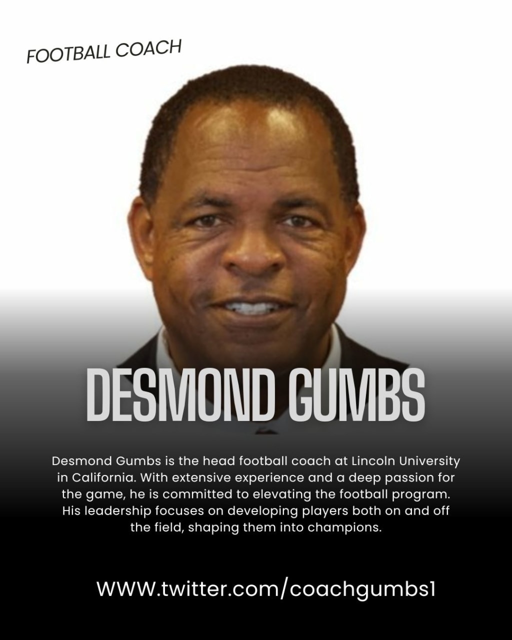 Desmond Gumbs is the head football coach at Lincoln University in California. He is dedicated to making the football team even better and has a lot of experience. He leads with passion, shaping players into champions.